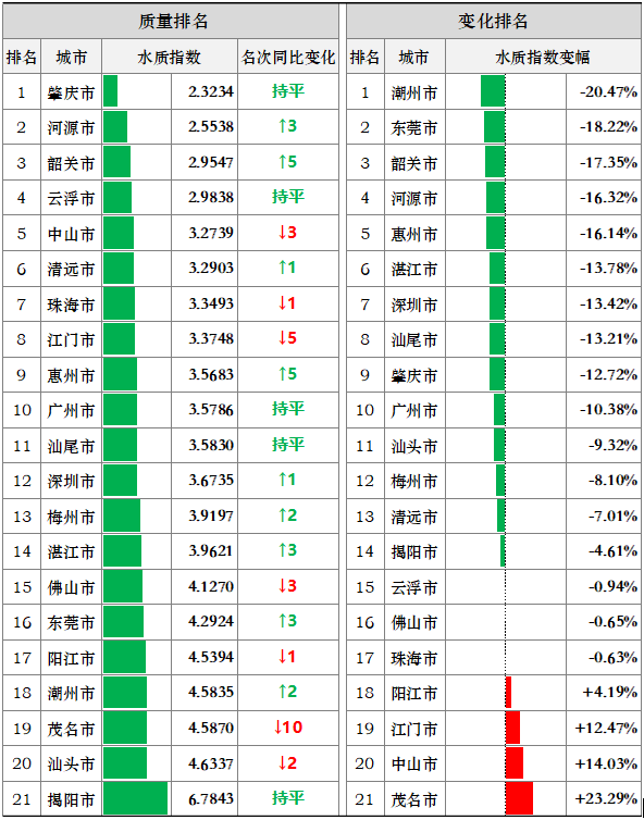 城市排名:149個國控斷面中,城市水質指數(shù)排名前三位為肇慶、河源、韶關市,后三位為揭陽、汕頭、茂名市。潮州、東莞、韶關等17市水環(huán)境質量同比有所改善,茂名、中山、江門等4市同比有所下降。