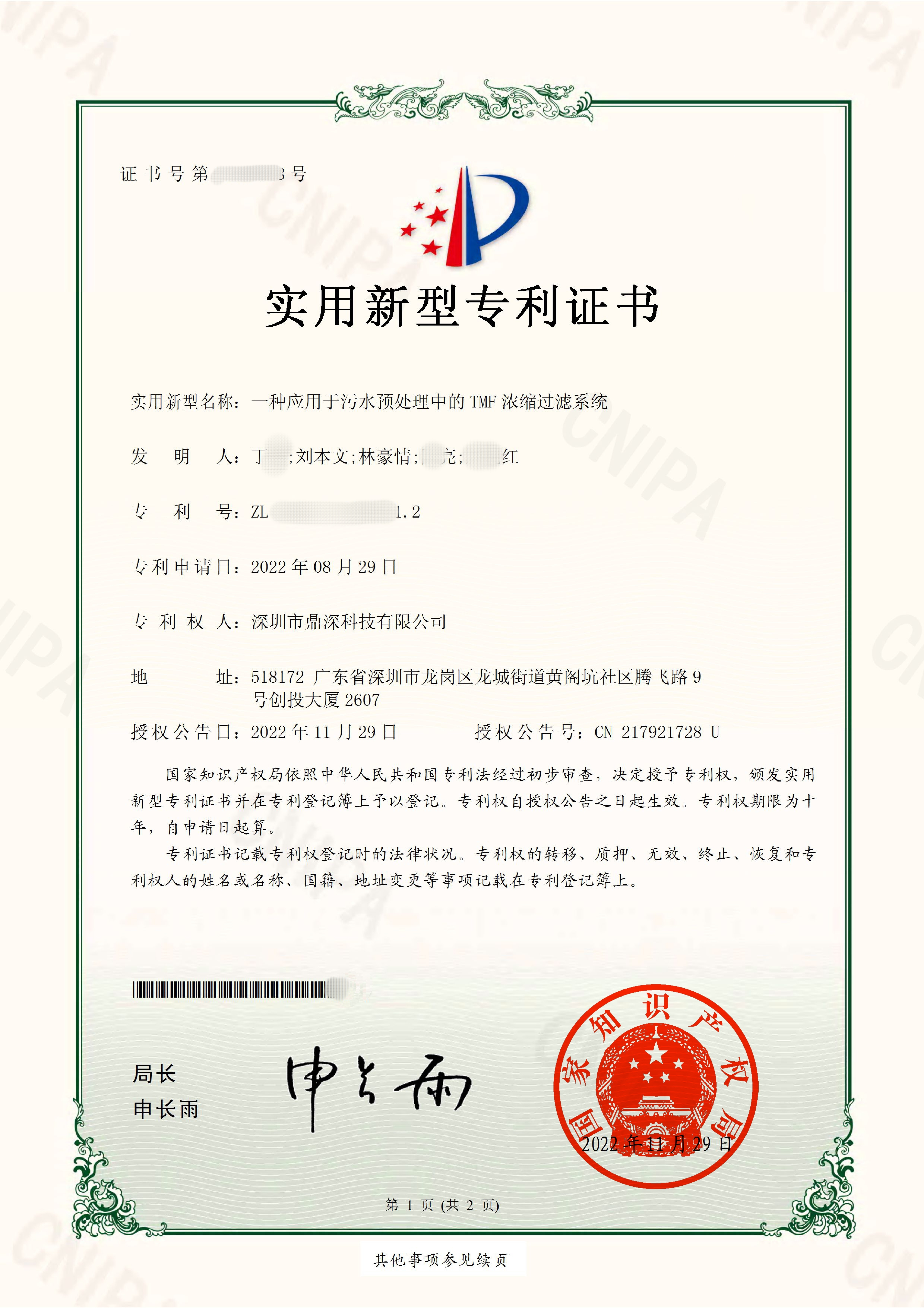 繼專利《雙級(jí)熱泵真空蒸發(fā)污水濃縮系統(tǒng)》、《一種高效的生物脫氮除磷環(huán)流反應(yīng)器》之后,11月29日,又一項(xiàng)深圳市鼎深科技有限公司(以下簡(jiǎn)稱“鼎深科技”)申報(bào)的實(shí)用新型專利經(jīng)過國(guó)家知識(shí)產(chǎn)權(quán)局的初步審查,被授予專利權(quán)并頒發(fā)實(shí)用新型專利證書。